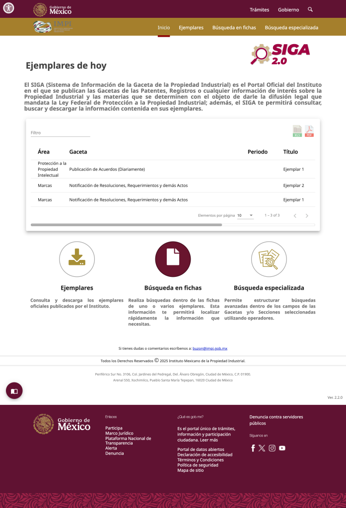El SIGA (Sistema de Información de la Gaceta de la Propiedad Industrial) es el Portal Oficial del Instituto en el que se publican las Gacetas de las Patentes, Registros o cualquier información de interés sobre la Propiedad Industrial y las materias que se determinen con el objeto de darle la difusión legal que mandata la Ley Federal de Protección a la Propiedad Industrial; además, el SIGA te permitirá consultar, buscar y descargar la información contenida en sus ejemplares.
