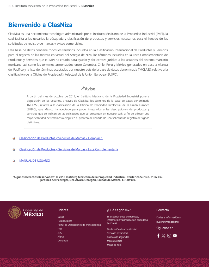 ClasNiza es una herramienta tecnológica administrada por el Instituto Mexicano de la Propiedad Industrial (IMPI), la cual facilita a los usuarios la búsqueda y clasificación de productos y servicios necesarios para el llenado de las solicitudes de registro de marcas y avisos comerciales.
